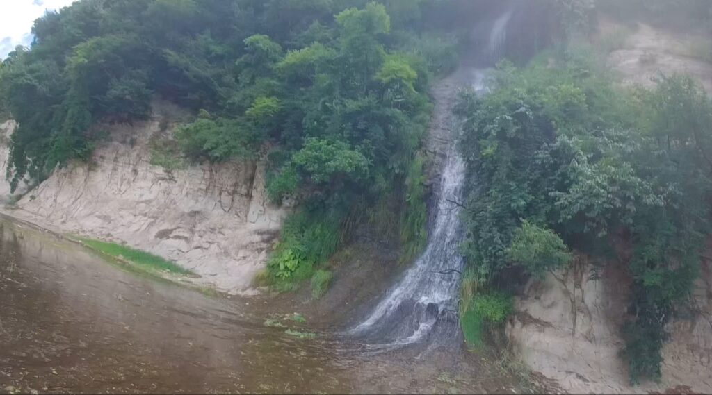 右岸には大きな滝が2本流れており、下で滝行体験ができます。川下りの途中でリフレッシュに最適です。